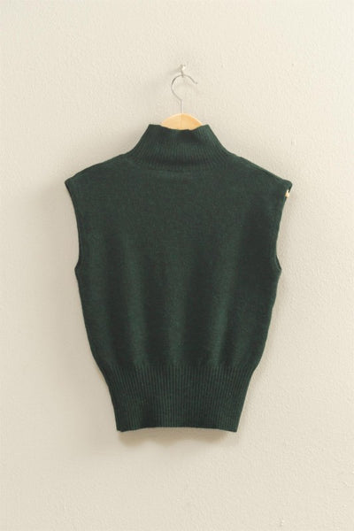 Embrace style with this sleeveless knit top featuring a fitted high neck and slightly extended shoulders for a relaxed, comfortable fit. The ribbed hem hugs the body for a sleek silhouette. Perfect for layering or wearing alone, it pairs effortlessly with skirts or trousers. Its minimalist design adds subtle sophistication, ideal for casual outings. 45% ACRYLIC 27% POLYESTER 26% NYLON 2% WOOL Model Is 5' 7" Tall, 32" Chest, 25" Waist, 36" Hips And Wearing A Size Small Imported. Designed In The USA