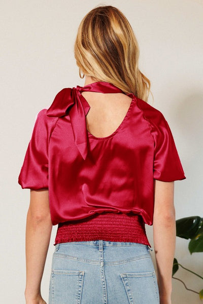 Waist smocked solid satin blouse featuring mock neck bow detail, and puff elbow sleeves. Also available in sizes 1XL to 3XL: Style no. IT15453P. Full Length: 24" Contrast: 100% Polyester