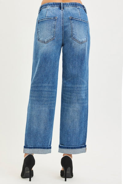 ELASTIC BAND SLOUCH ANKLE BOYFRIEND JEANS WITH CUFFED HEM - Rise 10 1/2" | Inseam 28"(After Cuff) 30"(Before cuff) in size 3/26 - Model Info: Height 5'9" | Waist 26" | Hips 36" - Model is wearing size 3 - Cuff can be released