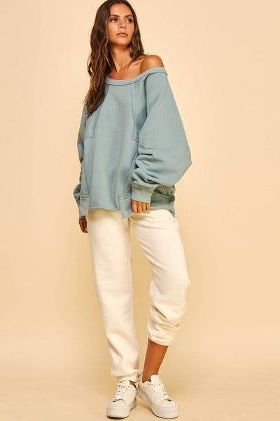 CAMDEN SWEATSHIRT PULLOVER TOP *The definition of an effortless essential, this cool and classic pullover is featured in an oversized, slouchy fit with raw, exposed seaming throughout for a true lived-in look. * Soft fabrication, ribbed hem and cuffs, drop-shoulder sleeves, high-low hem, seam detailing throughout, hand pockets - Ribbed hems - Oversized, slouchy fit - Soft fabrication, wide scoop neck, exposed seaming throughout - Side seam pockets - Soft fleece - Moderate stretch Fit: Slouchy, oversized fit, hip-length *Model is 5ft 8" and wears a size M *Model measurements: Bust 32", Waist 24", Hips 34"