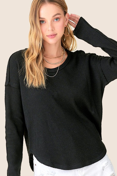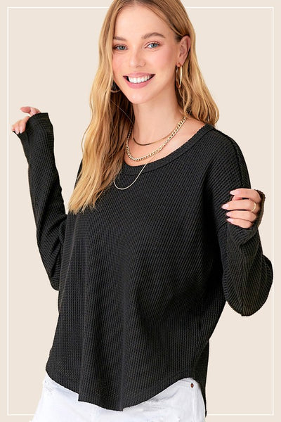 Raw Edge Detail Waffle Knit Long Sleeve Top