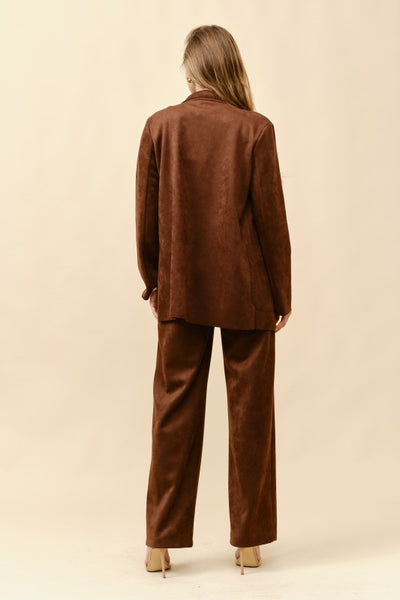 Faux suede Single breasted blazer 95%Polyester, 5%Spandex Model is wearing size: S Model Measurements Height: Bust: 32C" Hips: 36"