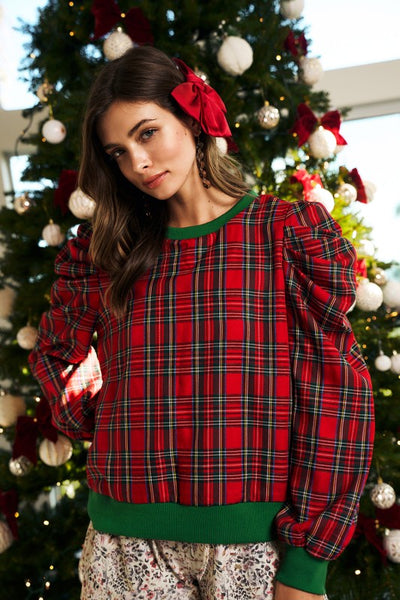 Christmas Plaid Puffed Shoulder Top CHRISTMAS PLAID PUFFED SHOULDER TOP RIBBED HEM AND CUFFS