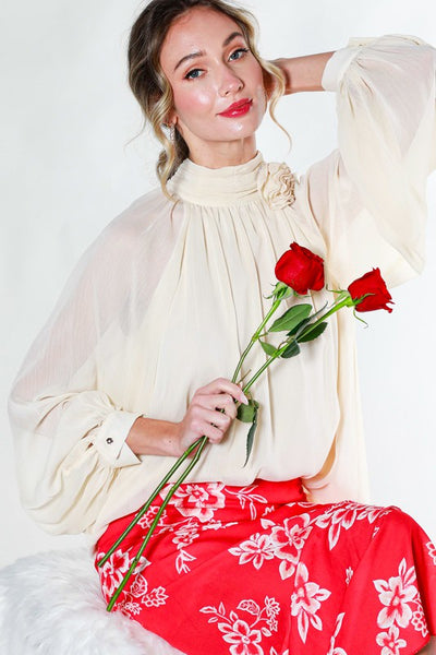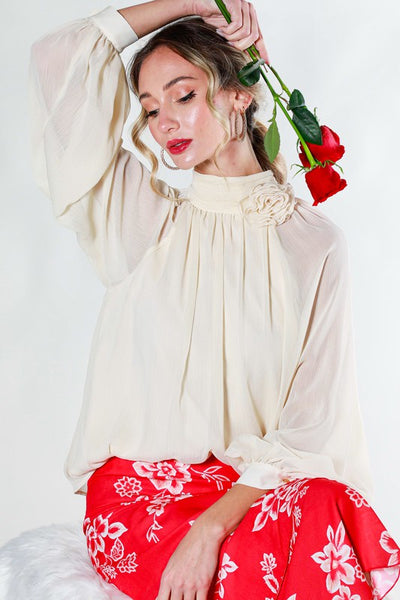 LONG PLEATED SLEEVE TIE BACK CORSAGE DETAIL LINED CHIFFON BLOUSE TOP