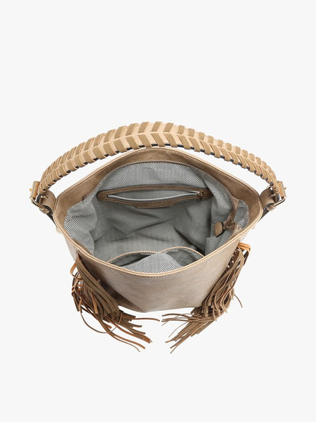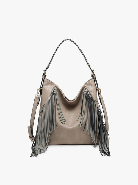 Sav Distressed Hobo with Fringe Detail -Type: Hobo Bag -Material: Vegan leather Details: -Whipstitch shoulder strap -Back zip pockets -Inner slip and zip pockets -Adjustable/removable shoulder strap -Gold-tone hardware Dimensions: -Length: 15 inches -Height: 12 inches -Depth: 5.5 inches -Drop: 10 inches The M2350 Sav Distressed Hobo with Fringe Detail offers a perfect blend of bohemian charm and practicality. Crafted from vegan leather with a distressed finish, this hobo bag exudes a laid-back, yet stylish vibe.