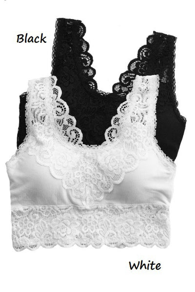 Padded lace bralette with a pretty rounded neckline, scalloped edges and an allover floral lace design. The back features a v hemline as well. 90% Nylon, 10% Spandex S/M: 32B, 34A, 34B M/L: 34C,36B, 36C
