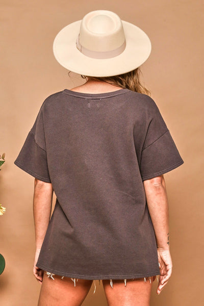 Lose fit contrast knit top. -Round neckline -Short sleeve -Side slits