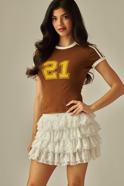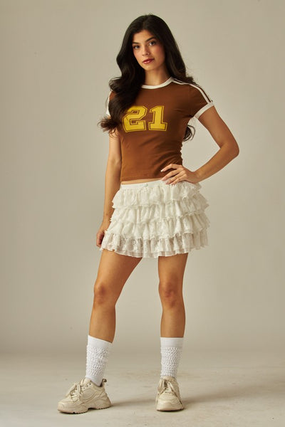 This mini skirt makes the perfect statement. With its sweet ruffled design you'll be sure to turn heads wherever you go.